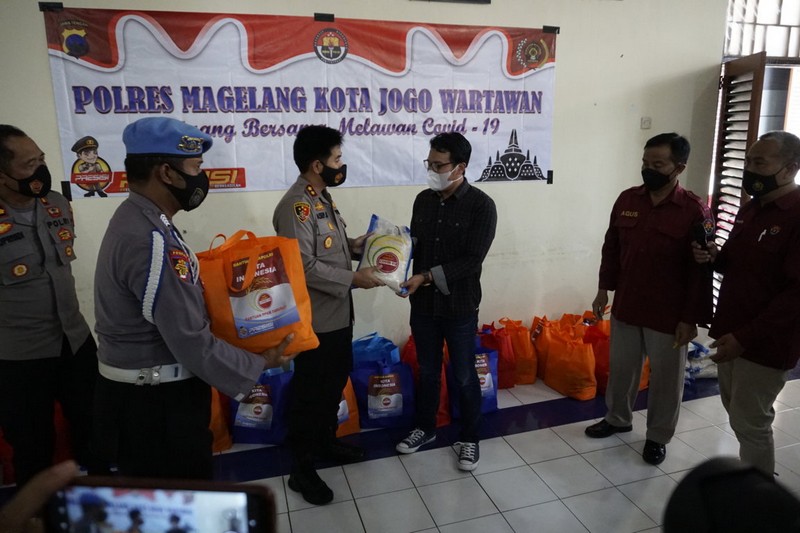 Pada kesempatan itu, Kapolres juga menyerahkan bantuan pangan kepada anggota PWI Kota Magelang dan organisasi jurnalistik lainnya. Bantuan berupa beras, minyak, mi instan, masker, handsanitizer, vitamin, dan lainnya ini merupakan kepedulian kepolisian terhadap wartawan.