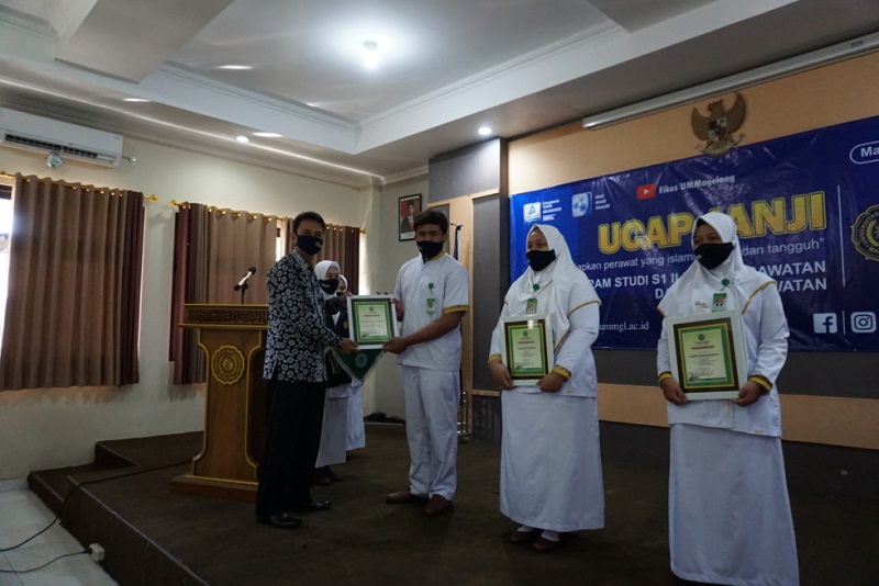 Sebanyak 77 mahasiswa yang terdiri dari 30 mahasiswa Program Studi (Prodi) S1 Ilmu Keperawatan dan 47 mahasiswa Prodi D3 Keperawatan Universitas Muhammadiyah Magelang (UNIMMA) melaksanakan ucap janji pada Senin (27/7). Acara dengan tema “Menyiapkan Perawat yang Islami, Unggul dan Tangguh” ini belangsung secara virtual.