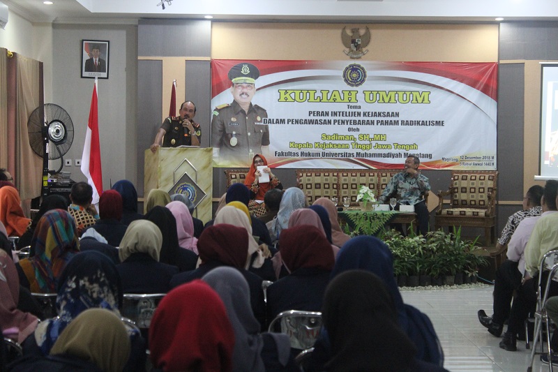 Dalam rangka peningkatan wawasan mahasiswanya, Fakultas Hukum (FH) UMMagelang mengadakan kuliah umum di Aula Fakultas Ilmu Kesehatan (Fikes) Kampus 2 UMMagelang pada Rabu (12/12). Kuliah umum diikuti oleh 200 mahasiswa FH dengan mengusung tema “Peran Intelejen Kejaksaan dalam Pengawasan Penyebaran Paham Radikalisme”.