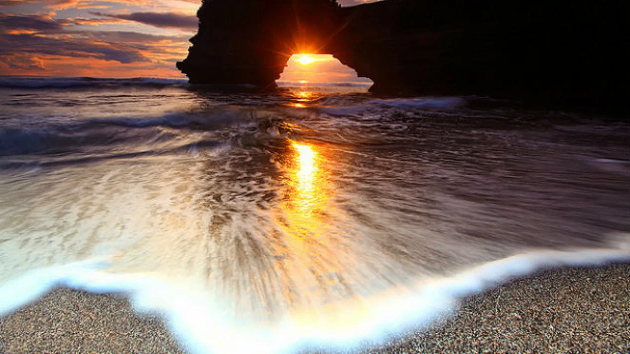 Pantai Batu Bolong dikenal sebagai salah satu tempat terbaik di Bali untuk menikmati matahari terbenam. Siluet pura di atas batu karang dengan latar belakang matahari yang tenggelam menciptakan pemandangan yang dramatis dan indah.