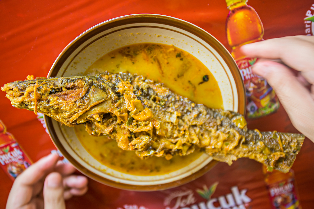 - Ikan yang telah digoreng dimasukkan ke dalam kuah santan dan dimasak dengan api kecil hingga bumbu meresap sempurna.