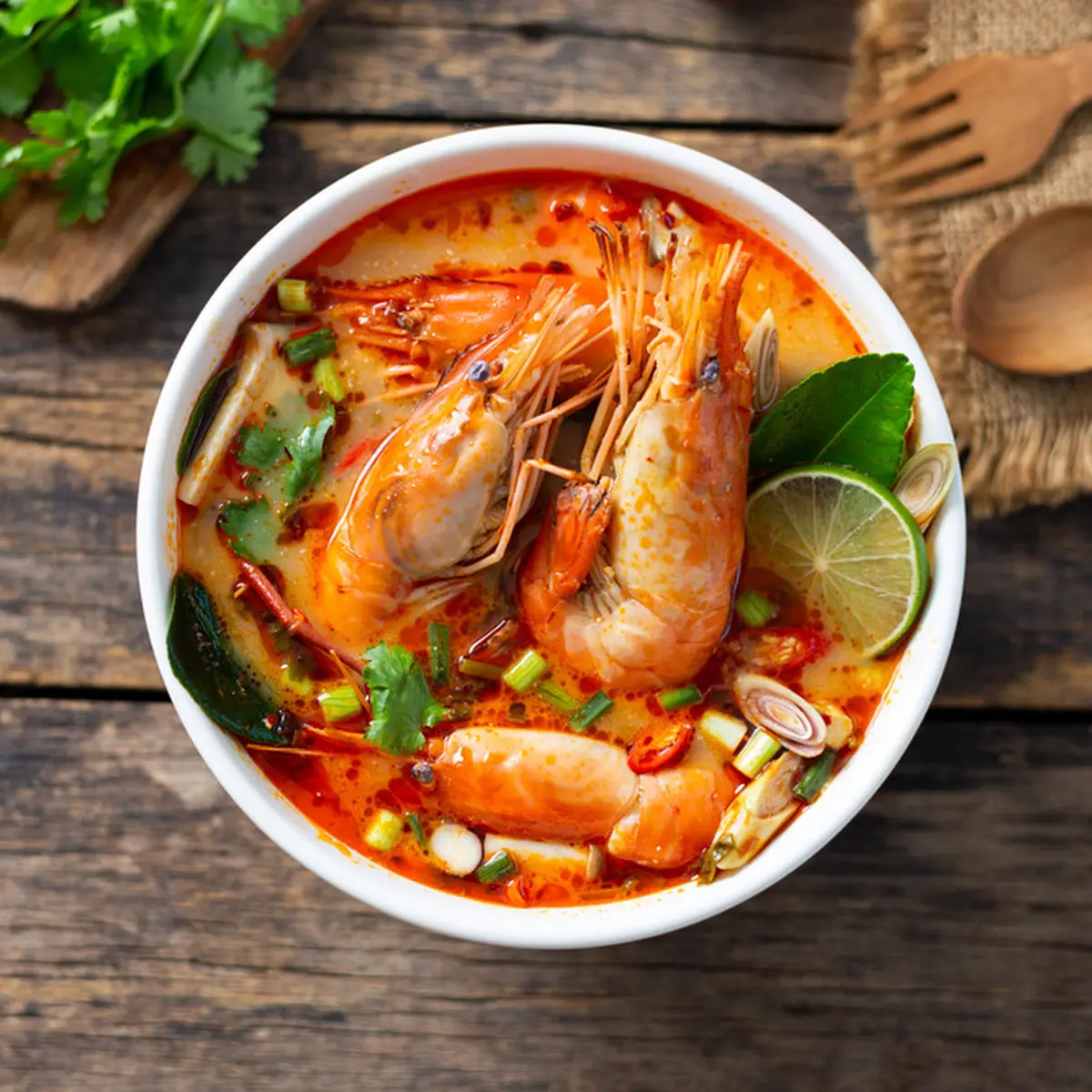 Sup udang dengan kuah bersantan ini menawarkan rasa gurih dan kaya, cocok untuk mereka yang ingin mencicipi Tom Yum dengan tekstur yang lebih creamy.